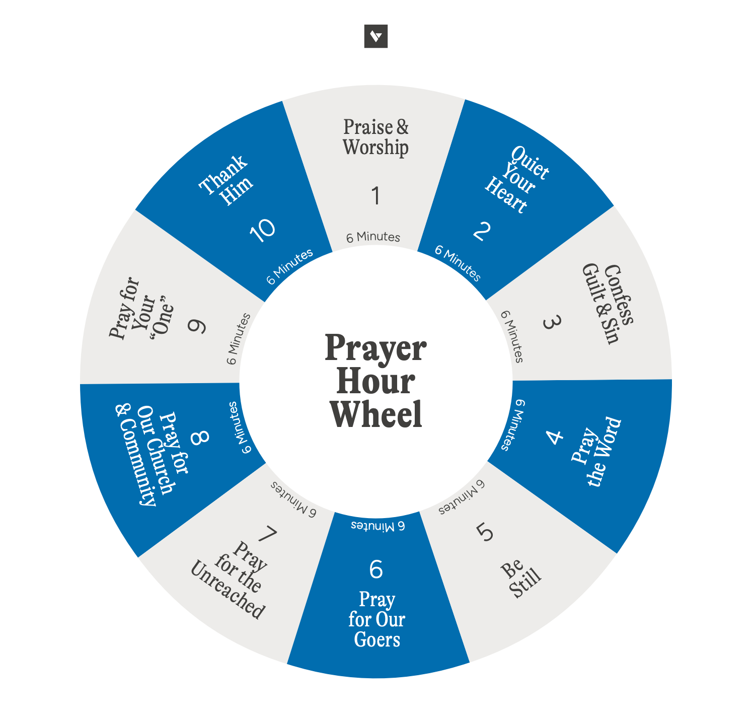 Our church is praying throughout the year in one hour blocks. Individuals sign up for a slot, and for many it’s the first time they have spent a full hour in continuous prayer. Our team created a prayer wheel to guide the time, and I’ve found it helpful in my own time blocks. We’re creating a 20 minute version for our kids ministry this summer, and I’m excited to see our children begin this rhythm!